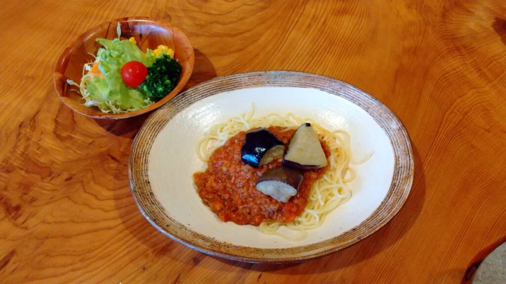 肉と野菜がたっぷり入ったミートソースの豊かな味わいをお楽しみください。サラダ付き